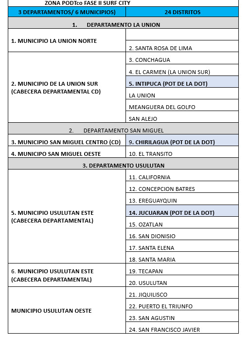 En el PODTco Fase I de Surf City se identifican y priorizan territorios que requieren planificación urbana detallada, con lineamientos y criterios normativos a aplicar en los Planes Parciales alineados con la normativa local y nacional y con los estándares de planificación urbana y social del BID. El PODTco es un instrumento de orientación de las inversiones públicas y privadas con regulaciones normativas a nivel de los dos Planes Parciales con su caracterización de playas con criterios normativos que potencien su vocación para fomentar el desarrollo turístico integral para regular los usos de suelo y actividades con estrategias para la mejora de la infraestructura, la dotación de equipamientos, el fomento del turismo, el apoyo a los emprendimientos y empresarios que propicie el dinamismo en la economía del sector turístico en El Salvador.